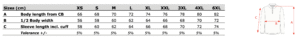 1/2 Body wijdte: maat S. 58 cm. – M. 60 cm. – L. 62 cm. – XL. 64 cm. – 2XL. 66cm. – 3XL. 68 cm. – 4XL. 70 cm. – 6XL. 72 cm.